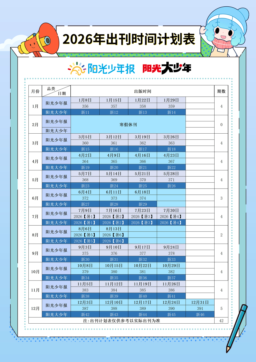 A:阳光少年报订期整月计算,如不特别备注,默认从下单当月开始(休刊期间下单默认休刊后起投),即每月月底最后一周周二11点前下单,默认当月起投,会补发当月已发出期数,向后顺延十二个自然月。除寒暑假及法定小长假休刊、不出报外,其余时间每周一期,全年约42期左右。介意可选择需要月份起投。