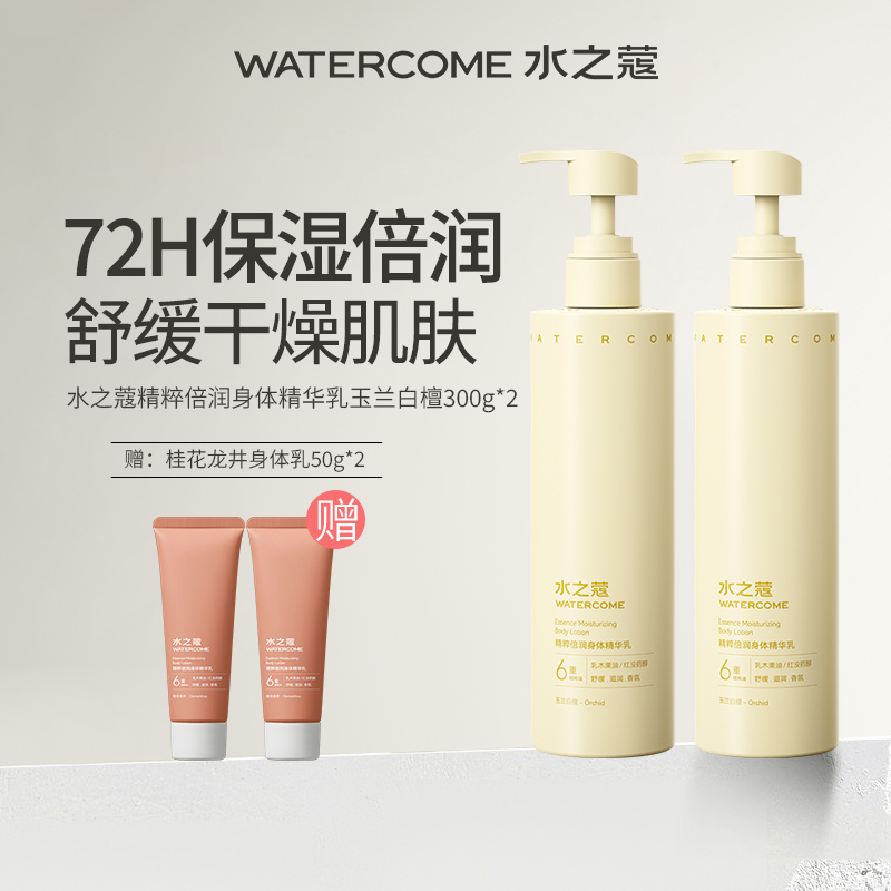 产品名称:水之蔻精粹倍润身体精华乳300g*2瓶(桂花龙井/栀子茉莉/玉兰白檀) 赠桂花龙井身体乳50g*2