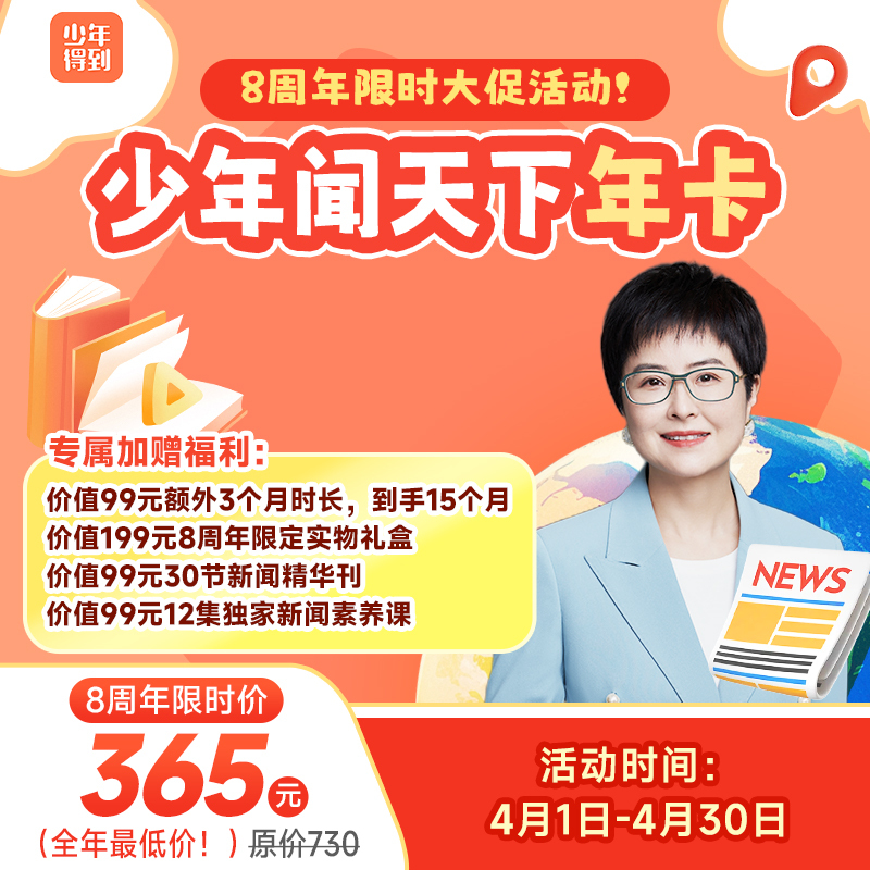 【课程包含】少年闻天下新闻课一年卡,12个月新闻课=8大主题新闻 312集+新闻素养课12集