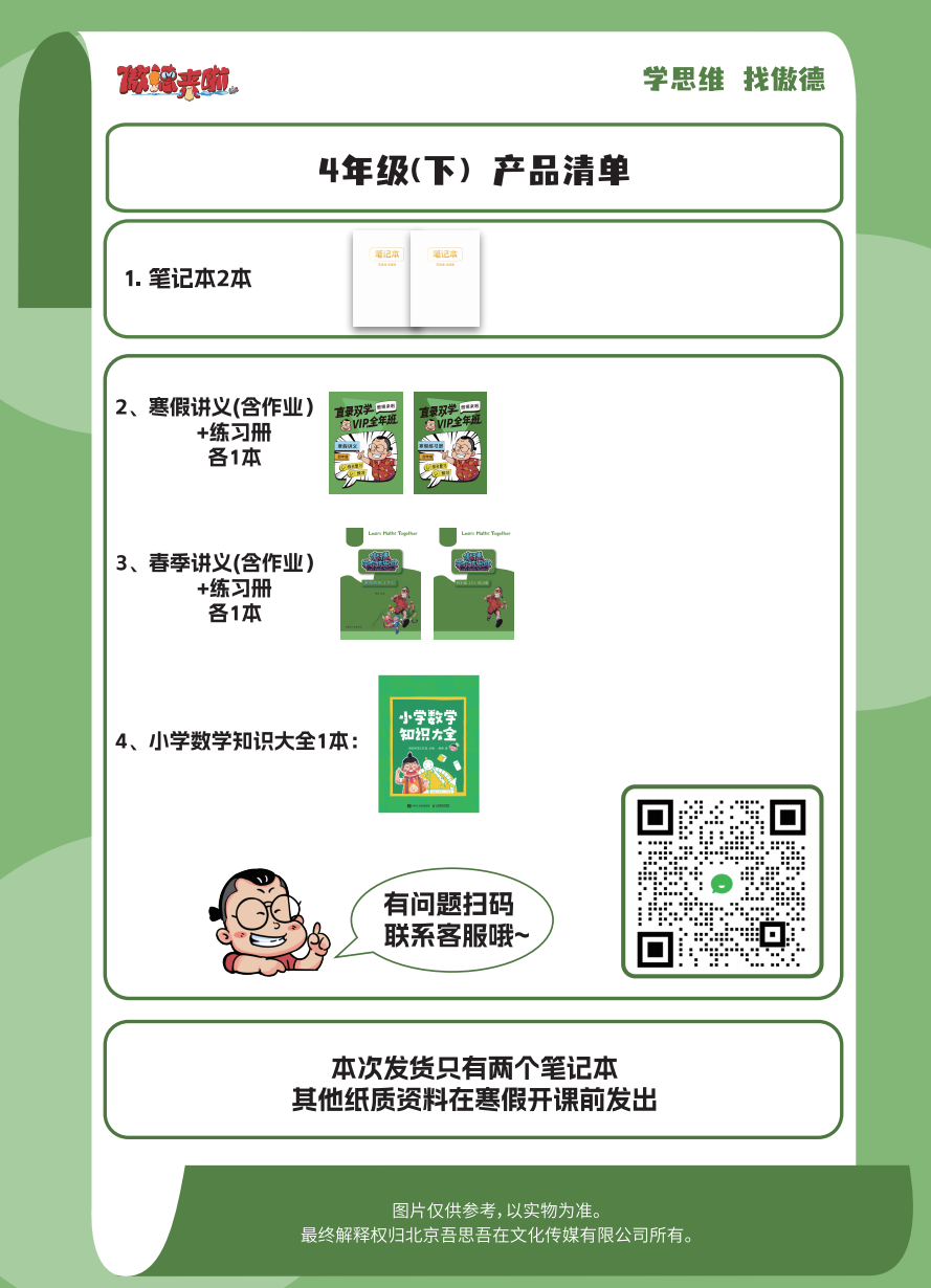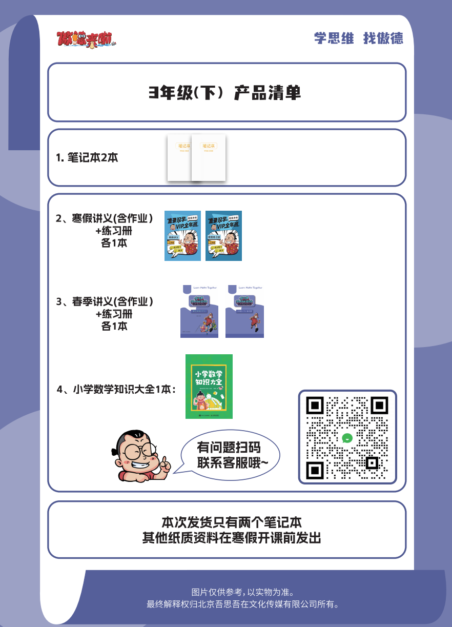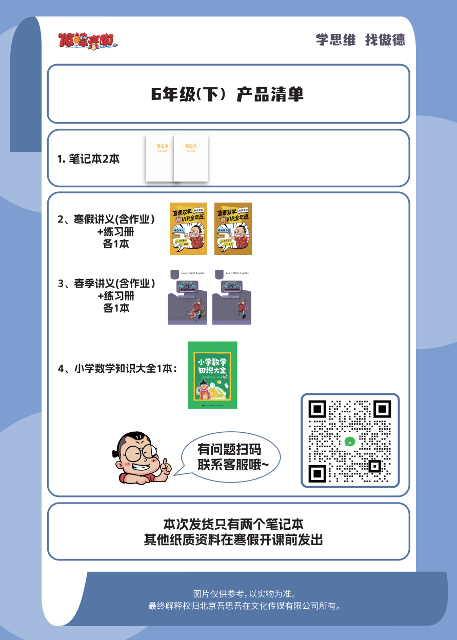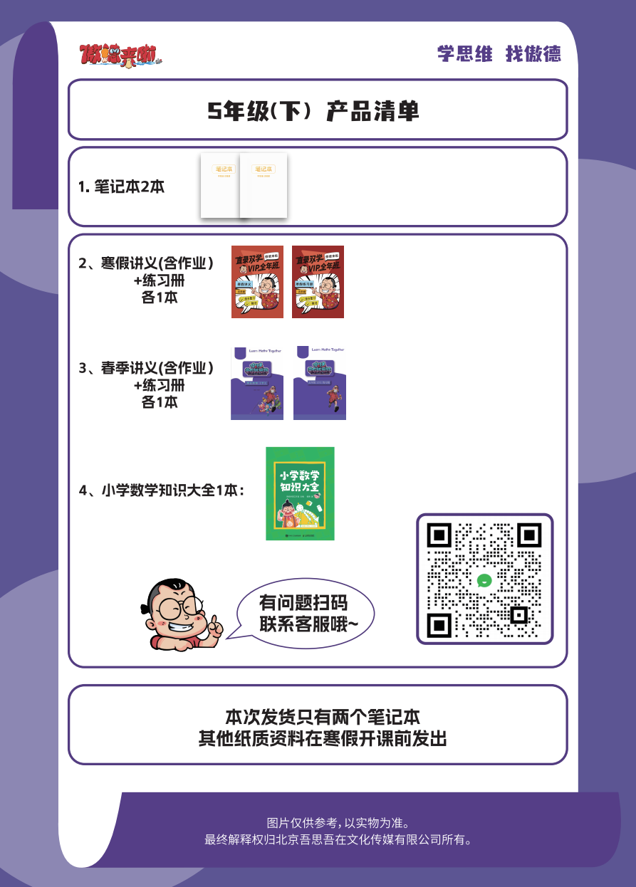 课程配套:群内答疑服务、小下学期易错点总结(电子版)、下学期单元测试卷(电子版)以及图书《小学数学知识大全》一本