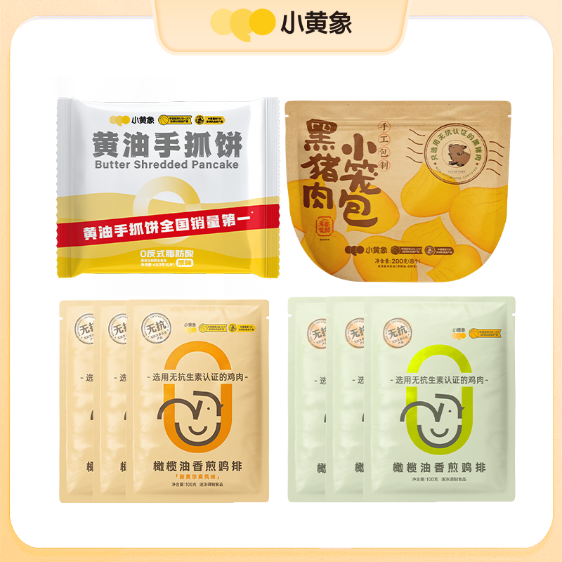 产品名称:小黄象手抓饼+香煎鸡排+奥尔良鸡排+黑猪肉小笼包