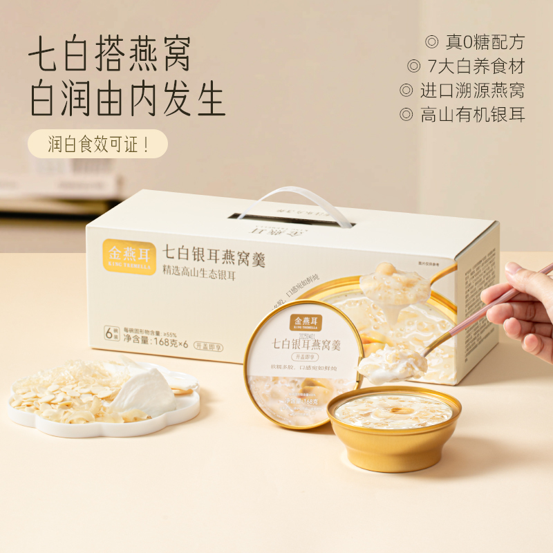产品成分:纯净水、鲜银耳(每碗添加量≥20g)、杏仁粉、木糖醇、椰浆粉(固体饮料)、芡实、白糯玉米、青稞、莲子、茯苓、百合、山药粉、燕窝