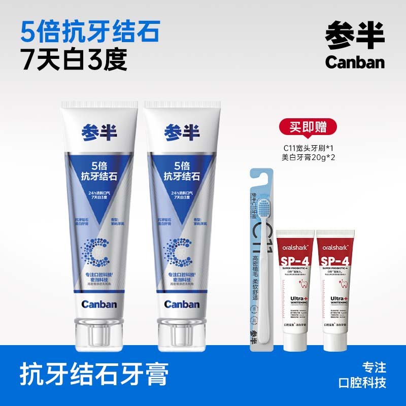 100g/支*2支【赠品:参半-美白牙膏20g×2+参半C11宽头牙刷×1】