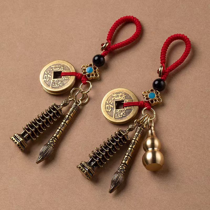 产品名称:普陀山纯黄铜五帝钱钥匙挂件