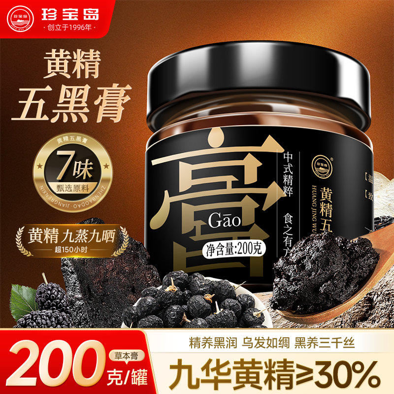 产品成分:黄精、桑椹、黑芝麻、黑果枸杞、黑米、黑大豆、耳叶牛皮消