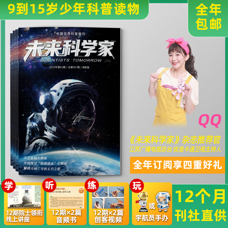 年刊赠送实物赠品随第一期杂志一同寄送;配套赠送12期*2篇音频书+12期*2篇创客视频+12期院士领衔讲座资源,随刊印有专属二维码,扫码即可学习