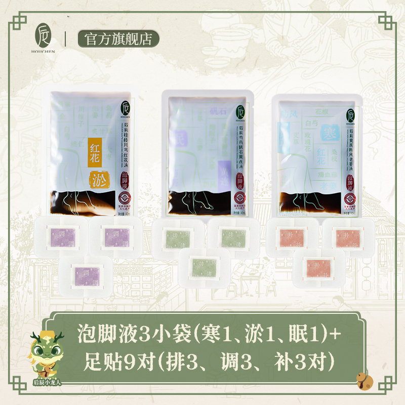 产品内含:泡脚液3小袋(寒1、淤1、眠1)+足贴9对(排3、调3、补3对)