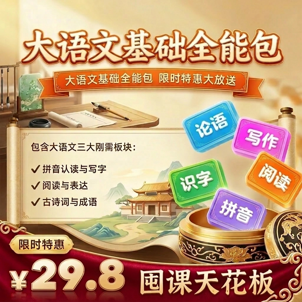 1、仅限未购买过大语文基础积累全能包的新用户购买1单,不可重复购买!购买过有道大语文听说读写练全能包的用户慎拍,内容有重复!