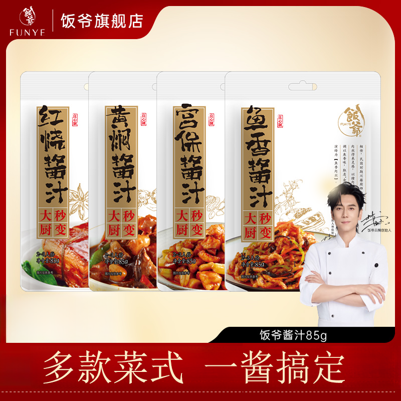 产品规格:红烧酱汁85g*4袋、黄焖酱汁85g*4袋、鱼香酱汁85g*4袋、宫保酱汁85g*4袋